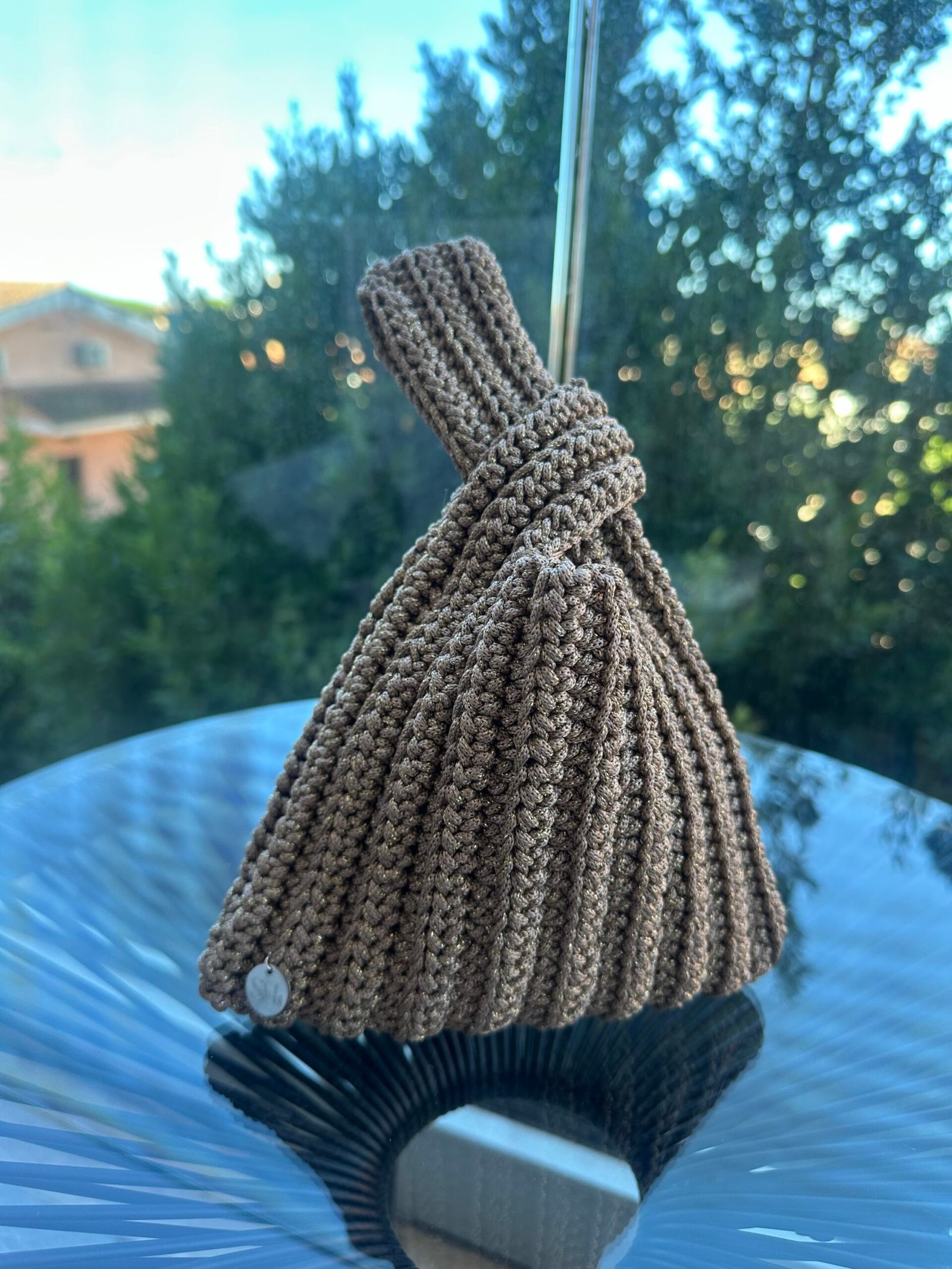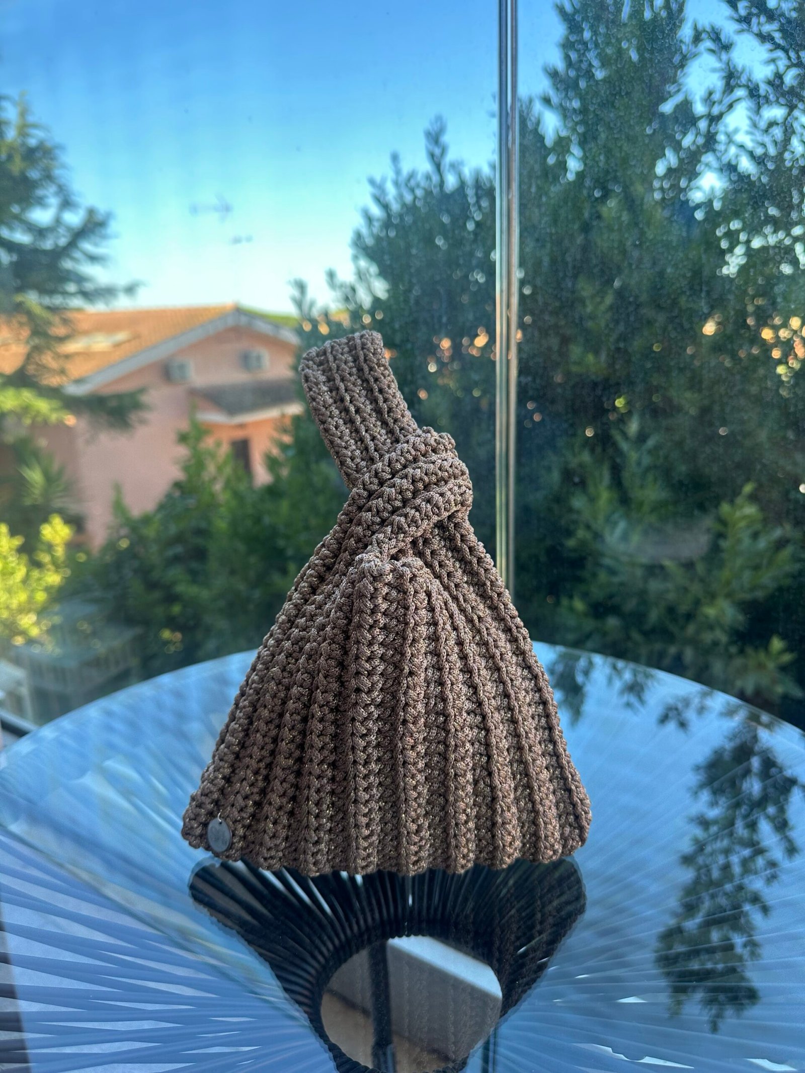 Realizzata interamente a mano all’uncinetto con cordino pregiato, unisce eleganza artigianale e praticità quotidiana.